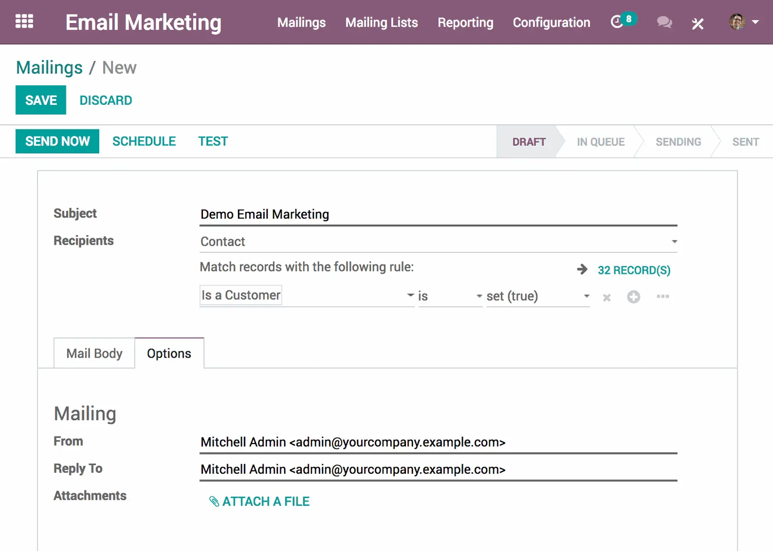 Amb el mòdul email marketing d’Odoo, pots crear campanyes d’email professionals utilitzant plantilles reutilitzables, adaptar-les segons el tipus de públic i programar els enviaments perquè s’enviïn en el moment més oportú.